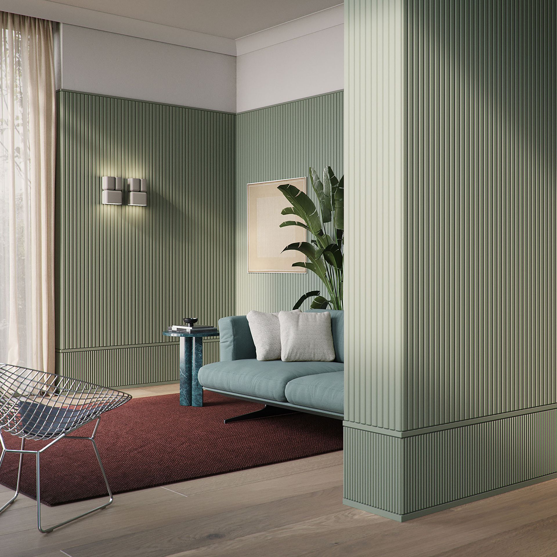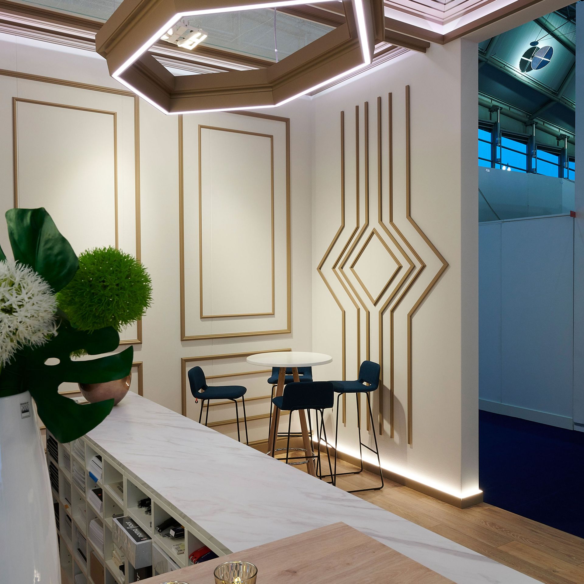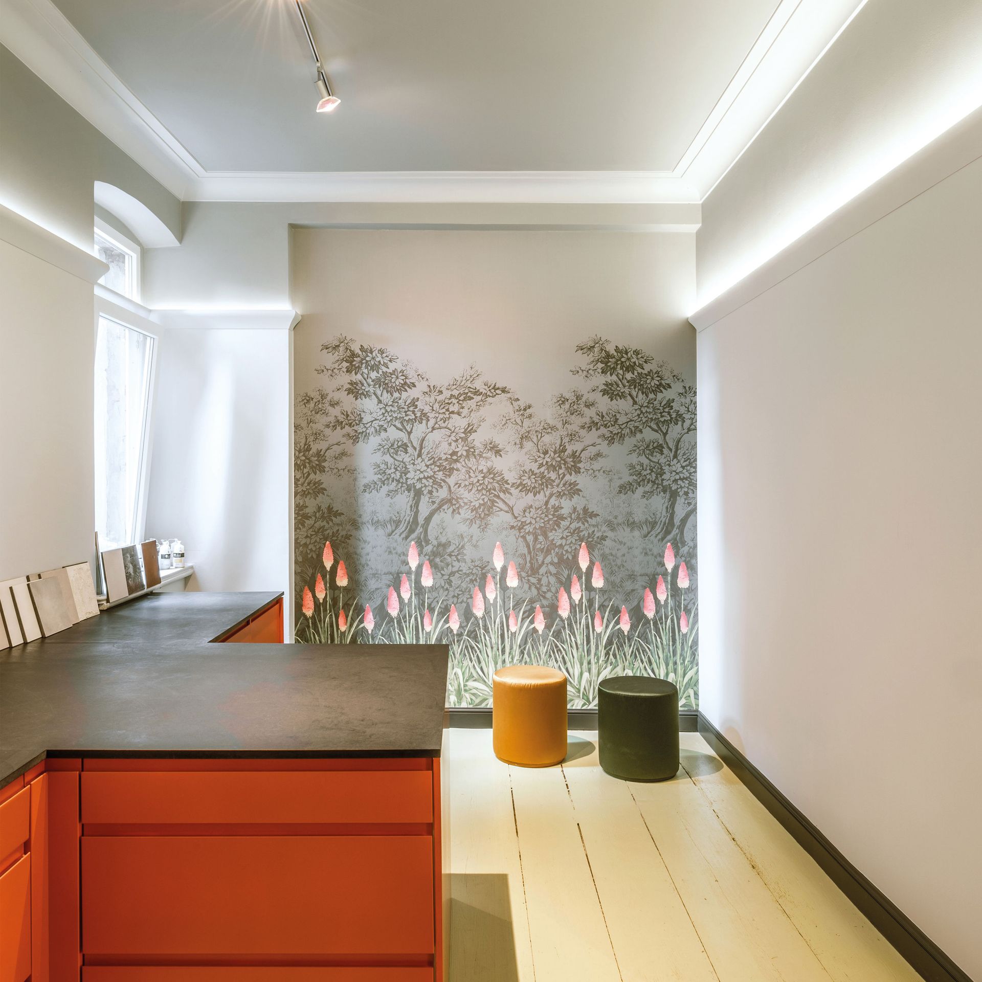 Mit direkter oder indirekter Beleuchtung kombinierbare Decken-, Wand- und Sockelleisten sowie Wanddekoraktionselemente schaffen ein gemütliches Ambiente und je nach Lichtintensität ein variables Raumgefühl.